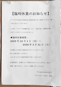 2025/10/1〜2026/03/末(予定)まで体調不良の為、臨時休業をさせていただきます。